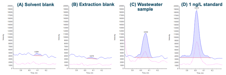 Direct injection preparation: Thawed wastewater from each site was filtered through a 0.2 µm filter into a glass tube. A 1 mL aliquot was transferred to a glass vial and spiked with an internal standard mix for LC-MS/MS analysis. Laboratory blanks comprised of acidified MilliQ water were prepared in the same manner for quality control.
