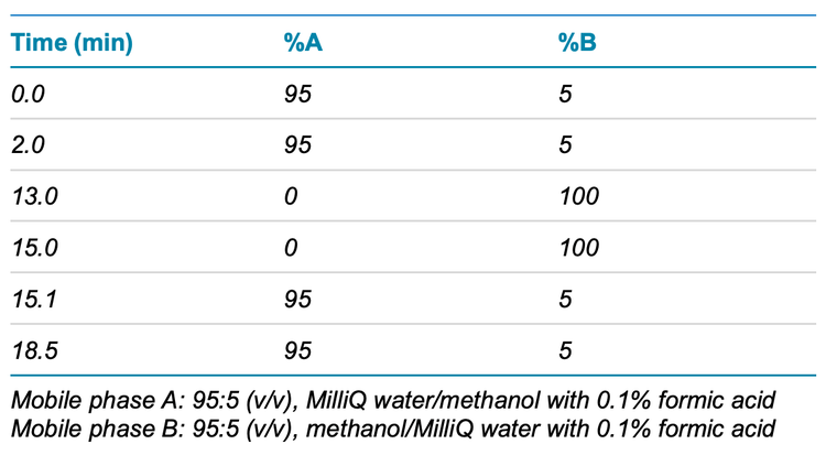Chromatography: LC separation was performed on a Shimadzu Nexera LC40 system using a Phenomenex Kinetex Biphenyl column (50 x 2.1 mm, 2.6 µm) fitted with a SecurityGuard ULTRA Biphenyl cartridge. A flow rate of 0.35 mL/min, an injection volume of 10 µL and a column temperature of 40ºC were used. The gradient used is shown in Table 1.