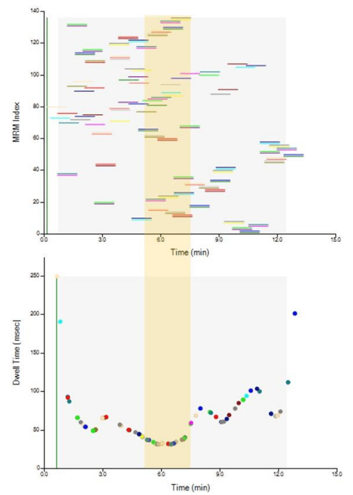 These sMRM summary plots can be used to visually assess the acquisition method during method development. For example, the user might want to manually increase the software-calculated dwell times to optimize the acquisition signal of transitions eluting in regions of high concurrency, as shown in the yellow shaded region in Figure 2.