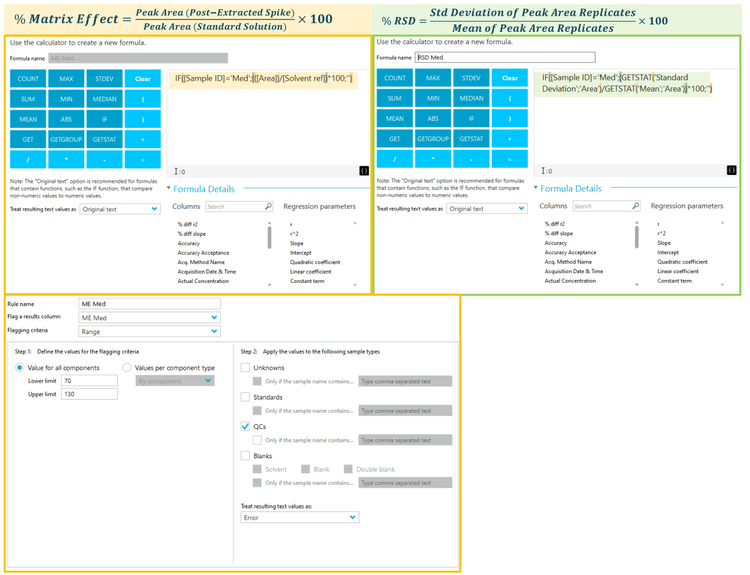 Rather than transferring the data and performing the calculations elsewhere, the calculated columns feature in SCIEX OS software allows the user to calculate the matrix effects directly in the results table. In addition, the user can selectively apply the calculations to specific samples. For example, as shown in Figure 4, an IF condition can be used to apply the formulas for matrix effects (orange) and %RSD (green) only to the medium level wastewater spikes (Sample ID = Med) so that these calculations would not be propagated to other irrelevant samples.
