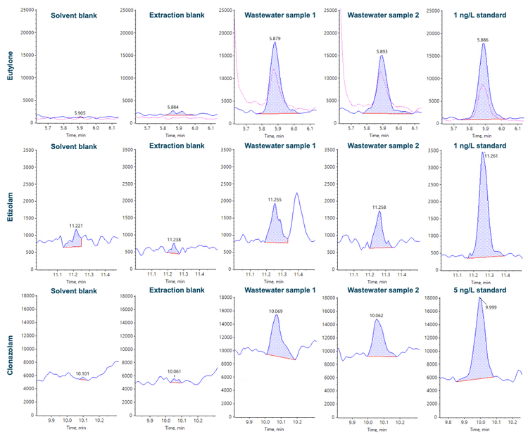 As shown in Figure 7, both the quantifier and confirmation transitions of eutylone were observed in 2 wastewater samples, while only the quantifier transitions were observed for etizolam and clonazolam. No significant contamination was observed in the solvent and extraction blanks. Here, the sensitivity of the SCIEX 7500 system enabled the detection of eutylone, etizolam and clonazolam in wastewater for the first time by a direct injection LC-MS/MS approach.