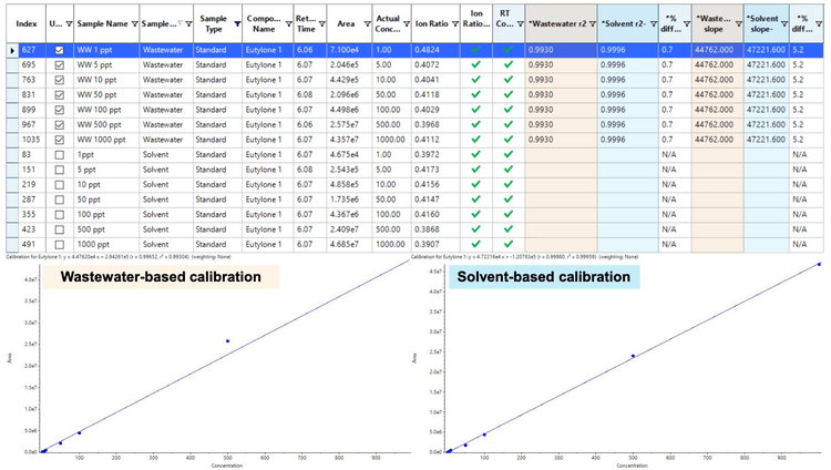 - Linearity performance was comparable between wastewater-based calibration and solvent-based calibration, which enabled the simpler solvent-based approach to be used for quantitation