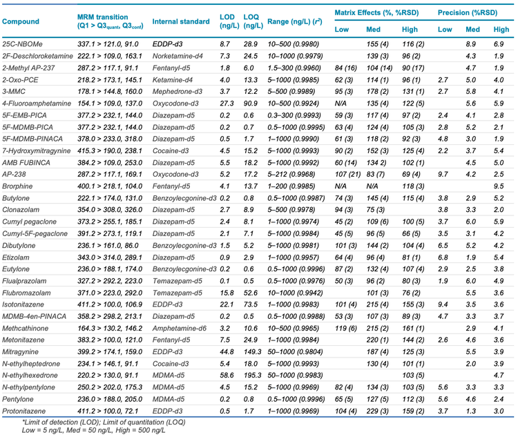 Wastewater surveillance of illicit drugs has been routinely used to study recreational drug consumption trends in many countries. 2 There has been an emerging interest in monitoring NPS at hotspots, such as music festivals at which drug usage might be increased. 1,3 Direct injection analysis minimizes contamination and irreproducible results but is challenged by low concentrations of NPS due to their infrequent consumption and their dilution in wastewater. Solid phase extraction (SPE) and liquid-liquid extraction (LLE) are typically required for the quantitation of low-level NPS, but these methods are laborious and time-consuming. 4,5 In addition, extraction conditions must be optimized to cover the wide range of physicochemical properties of different classes of NPS, such as synthetic cannabinoids, synthetic cathinones, synthetic opioids, benzodiazepines and phenylethylamines. In this work, the sensitivity of the SCIEX 7500 system allowed direct injection analysis of low-level NPS present in wastewater while enabling matrix dilution of interferences that would have otherwise been concentrated during SPE and LLE. High-throughput direct injection analysis can rapidly provide wastewater surveillance data to inform public health alerts and proactive drug education programs.