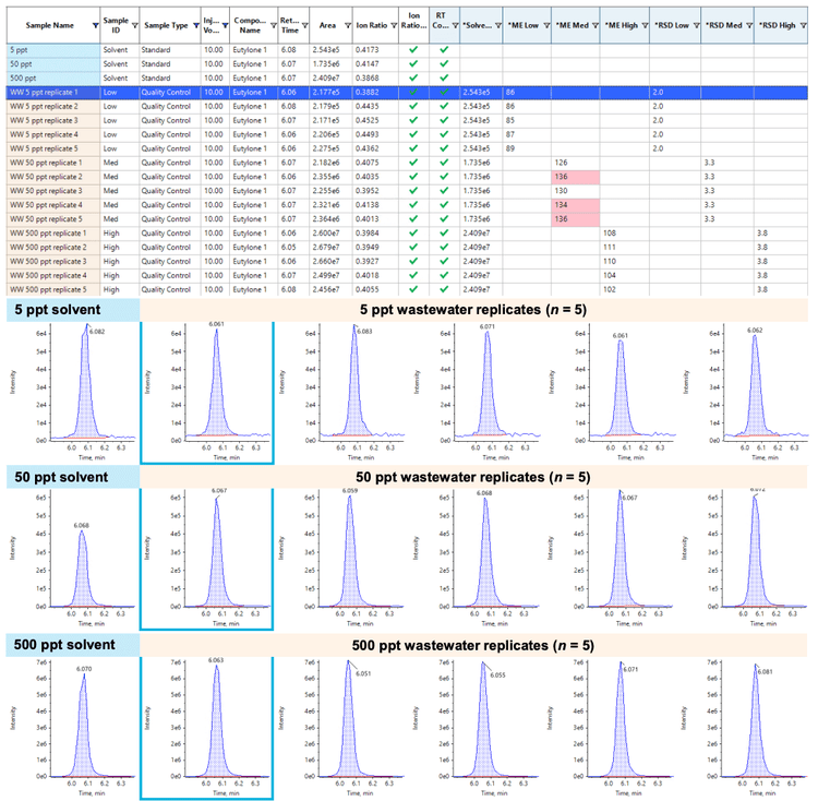 Out-of-bound validation results were identified using flagging rules to highlight values that did not meet user-specified tolerance thresholds. For example, the calculated matrix effects for some of the 50 ppt wastewater spikes were flagged (red) in Figure 3 because they exceeded the upper limit of 130%, as defined in Figure 4.