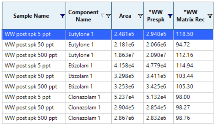 Direct injection analysis of influent wastewater samples collected over the summer of 2021–2022 detected eutylone, clonazolam and etizolam at several sites. Solvent and extraction blanks, duplicates and wastewater samples spiked before and after sample preparation were included to assess quality control. Acceptable matrix recoveries ranging from 95% to 119% were calculated for the 3 detected analytes based on their peak areas in wastewater spiked before and after sample preparation (Figure 6).