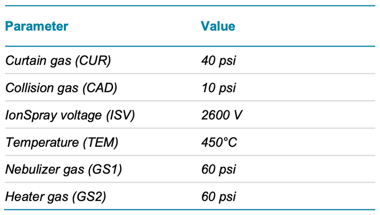 Data processing: All data were acquired and processed using SCIEX OS software, version 2.1.6. Analyte peak areas were normalized to their corresponding surrogate internal standards. Table 3 lists the quantifier and confirmation MRM transitions and the surrogate internal standard assigned to each analyte. Custom calculations and flagging rules were used to expedite the review of data. These rules considered the tolerance range for method validation parameters, such as a ±20% ion ratio, RT within 2% of the standard and ±30% matrix effects.