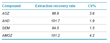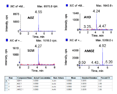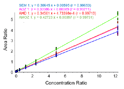 Chromatography was developed that enabled the separation of nitrofuran metabolites using a 9 min run time (Figure 1). Very good reproducibility of signal was observed at a concentration of 0.05 µg/kg. Concentration curves were generated across a concentration range of 0.05 to 5.0 µg/kg and demonstrated very good linearity (Figure 2) ensuring accurate quantification of samples at different concentration levels. Under the conditions of this method, the extraction recovery rate for the 4 compounds tested was between 94.5 and 101.7% (Table 3).