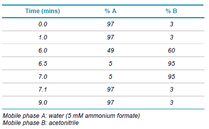 Chromatography: Separation was performed using the ExionLC™ System and a Phenomenex Kinetex C18 column (50×3.0 mm, 2.6 µm) and a flow rate of 0.4 mL/min. Column temperature of 40 °C and an injection volume of 20 µL.