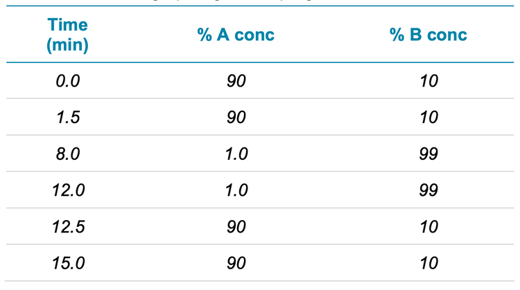 Chromatography: Chromatographic separation was performed using a Phenomenex Luna Omega PS C18, 100 Å, 100 mm x 2.1 mm, 3 µm (PN: 00D-4758-AN) column and a Phenomenex Gemini C18, 110 Å, 100 mm x 2.0 mm, 3 µm (PN: 00D-4439-B0) delay column. The injection volume was 50 µL and a flow rate of 0.4 mL/min was used. Mobile phase A was 20mM ammonium acetate in water and mobile phase B was methanol. Gradient conditions are shown in Table 1.