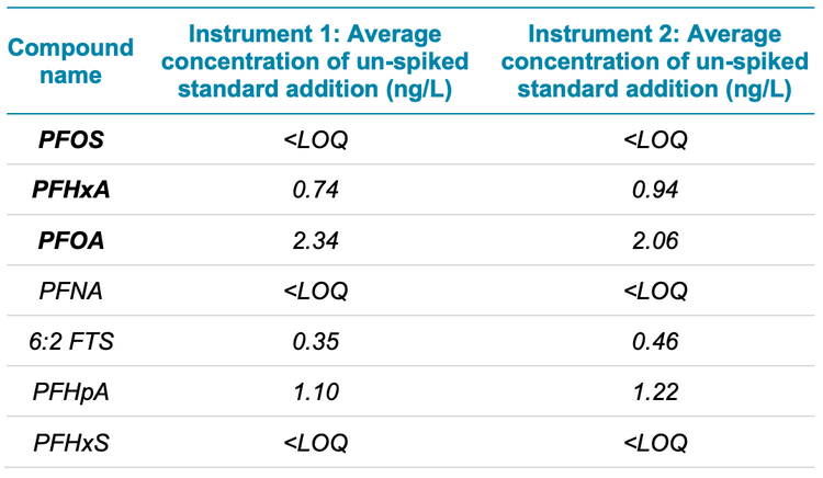 Table 6 compares PFAS compounds detected in un-spiked seawater on two different SCIEX 7500 systems when using the standard addition function in SCIEX OS software. The concentration of PFAS compounds detected in un-spiked seawater is comparable on both instruments when using standard addition. The average concentration of PFAS compounds in un-spiked seawater (Table 6) is also comparable to the concentrations calculated against the external standard calibration curve shown in Table 4, highlighting the robustness of this analytical method. Therefore, for this application, standard addition is viable when quantifying PFAS in the low ng/L range in seawater.