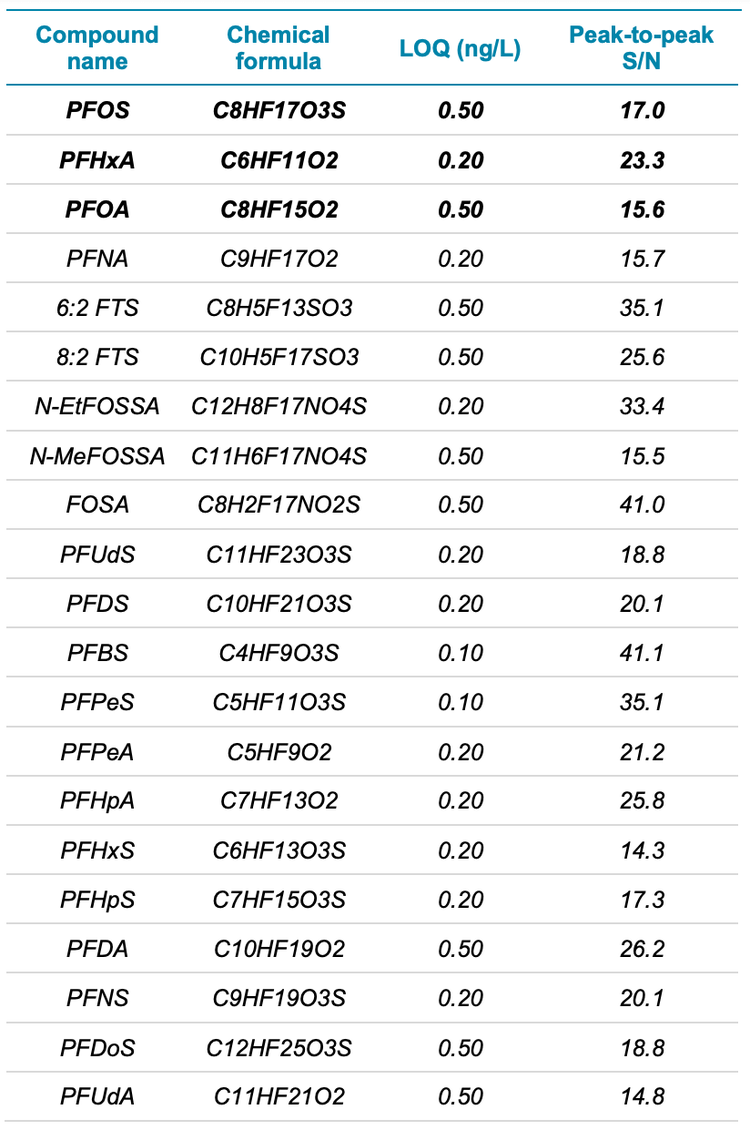 Table 2 highlights the LOQ values that were achieved for the PFAS compounds tested with this method in solvent (n=3). The criteria for LOQ determination were based on an average accuracy (%) of 70%–130% and an area %CV of <15%. The lowest current limit for PFAS compounds set by the European Parliament and Council of the European Union for drinking water is 100 ng/L. Table 2 illustrates the excellent levels of sensitivity achieved using this method.