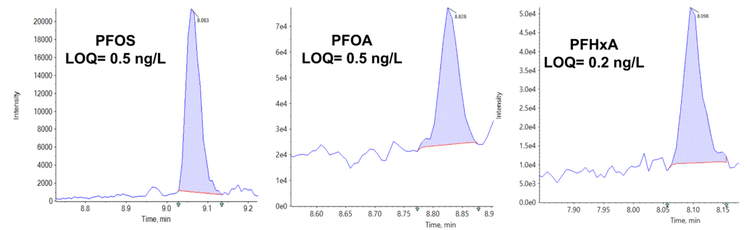 - Excellent sensitivity was achieved with limit of quantification (LOQ) values at sub-ng/L levels, as shown in Figure 1