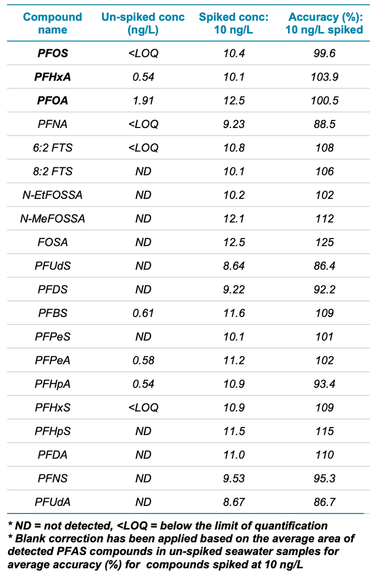 - All PFAS compounds detected in the un-spiked seawater samples were at low ng/L levels