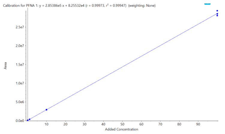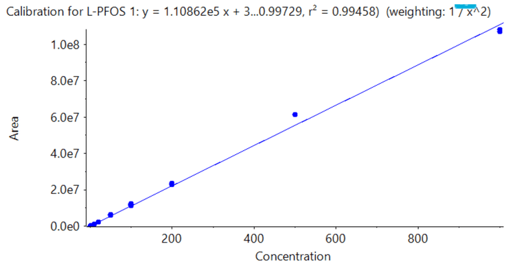 In addition, the linearity of each PFAS compound was evaluated (Table 2) with all r2 values >0.99 using a 1/x weighting. Figure 3 shows the calibration curve for PFOS and the respective r2 value.