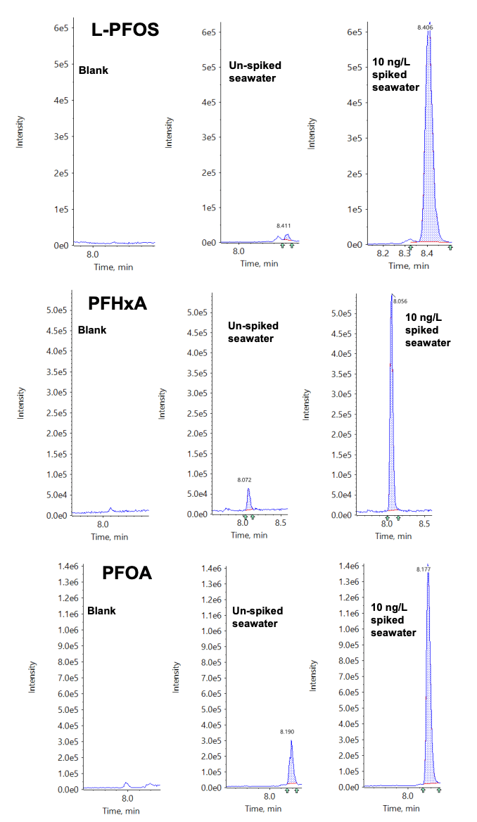 Un-spiked and spiked seawater samples (10 ng/L) were injected to assess accuracy. Table 4 provides a summary of the calculated concentration of PFAS compounds in un-spiked seawater injected once (correction has been applied based on the average area of detected PFAS compounds in un-spiked seawater samples) when compared to the external standard calibration curve. Figure 6 highlights the XICs of three PFAS compounds, including the blank, un-spiked and spiked seawater samples.