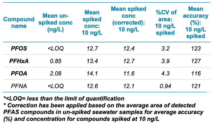 The average accuracy and precision were assessed for four of the most commonly reported PFAS compounds spiked at 10 ng/L in order to gain an average accuracy and %CV of area. Table 5 shows the calculated concentration of PFOS, PFHxA, PFOA and perfluorononanoic acid (PFNA) compounds in un-spiked seawater when compared to the external standard calibration curve, area %CV and average accuracy (%) for three injections at 10 ng/L.