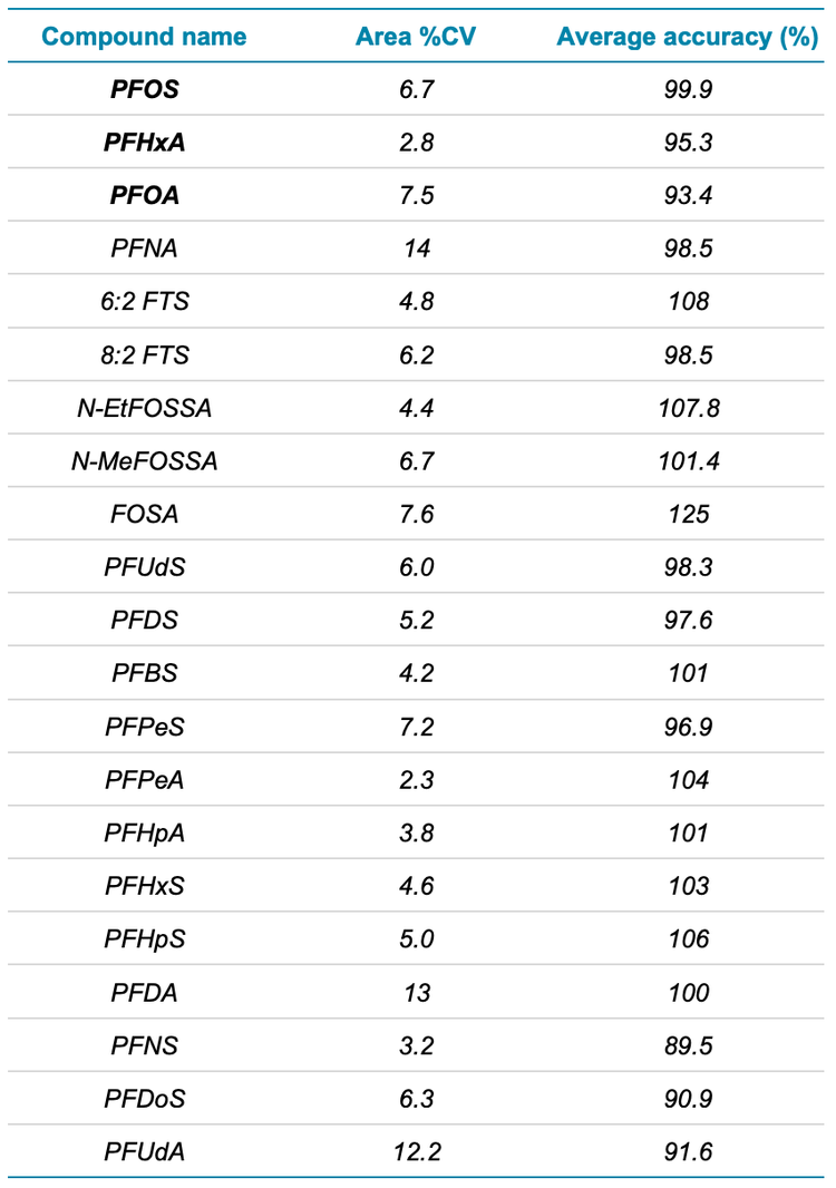 - For PFAS standards in solvent, the area %CV was <15% and average accuracy (%) was 89.5%–125.5%, which were all within acceptable criteria (<15% for %CV and 70%–130% for average accuracy)