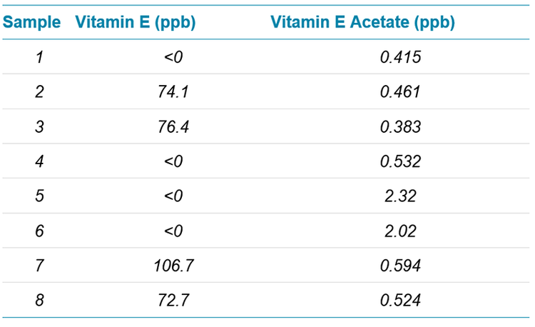 Thirty-three vape oils from a wide variety of sources were analyzed using the method. Typical results from a subset of these samples are shown in Table 4. These representative results show that vitamin E acetate is detectable in all the products, while vitamin E is not detected in any of the products. The data also demonstrate that there is no correlation between the concentration of vitamin E and vitamin E acetate.