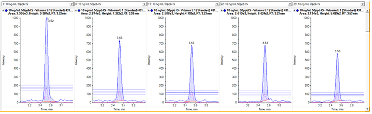 The calibration was run 5 consecutive times to demonstrate the precision and stability of the method. Very good reproducibility was obtained and is shown in Table 3. The percent CV for the 5 injections was 6% except for vitamin E at 10ppb, which had a percent CV of 9%. The measured accuracy ranged from 83% to 118% and was generally within 10% of the expected value. These data demonstrate that highly reproducible analytical results are observed using this method. These values indicate that the accuracy expected to be obtained with this method will meet analytical requirements, based on the regulation in place for residues testing. Figure 3 shows the MRM group for vitamin E acetate for each of the five 10ppb injections. The ion ratios (ratio of primary MRM signal to secondary MRM signal) for each of the injections demonstrates that reliable ion ratios are consistently obtained even at low concentration.