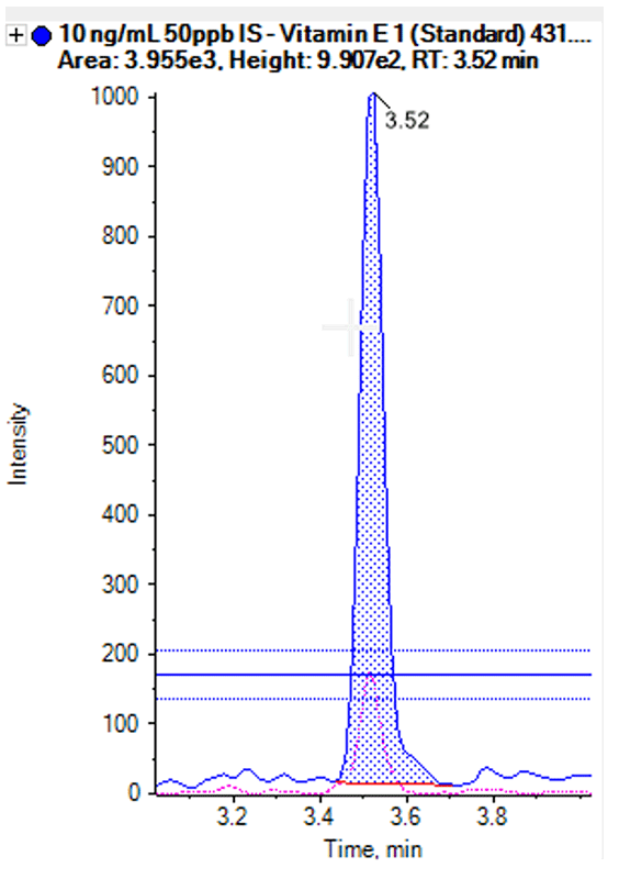Sample preparation: Samples were prepared for analysis by dissolving 500mg of sample in 40mL of methanol. The injection solvent contained vitamin E d6 at a concentration of 50ppb. This was used as the internal standard for quantitation. The diluted sample was analyzed without any further processing.