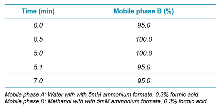 Chromatography: Chromatographic separation was achieved using an Agilent Poroshell 120 EC-C18, 2.7µm, 100 X 4.6mm column with a solvent flow rate of 1.2 mL/min. The column oven was set to 50°C. 5 µL injection volume was used. The chromatographic gradient and mobile phases are outlined in Table 1.