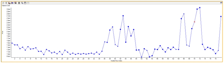 The peak areas for the internal standard, vitamin E d6 are shown in Figure 4. The plot shows area values for the injected samples of a single batch. The standards (represented by closed circles) run at the start of the batch show a very stable response during the analysis of the calibration solutions with an RSD of 12%. The IS areas for the samples (represented as squares) show elevated areas for some of the standards resulting in an RSD for the sequence of 37%. Elevated areas for the internal standard were not observed for all samples and appear to be related to those samples that had high concentrations of vitamin E. The areas do, however, demonstrate the need for using an internal standard to achieve accurate quantitation.