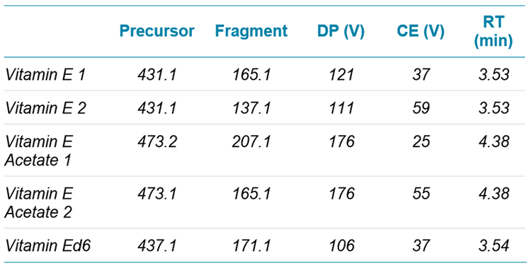 Recently there has been a large number of people that have been adversely effected from inhalation of vaping liquids. The cause is currently uncertain however techniques for the more specific detection of Vitamin E Acetate in a broader variety of matrices has been requested.Here, a method has been developed for the analysis of Vitamin E and Vitamin E Acetate using mass spectrometry, to provide the increased specificity and therefore confidence in detection. Using the SCIEX Triple Quad™ 3500 LC-MS/MS System, the workflow provides accurate and precise quantitation results of these compounds in vaping oils from 0.01% to 0.5%.