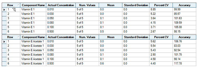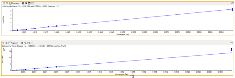 Calibration curves for Vitamin E and Vitamin E acetate were acquired from 10ppb to 500ppb. An example curve is shown in Figure 2.The top trace is the calibration curve for the primary MRM transition of vitamin E and the bottom calibration is the primary MRM transition for vitamin E acetate. Both compounds exhibit excellent linearity over this range (r-value >0.98).