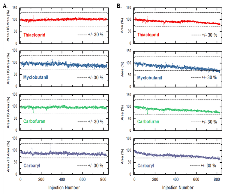 - Peak area variance ˂5% RSD for carbaryl, carbofuran, myclobutanil and thiacloprid, corrected for with internal standard