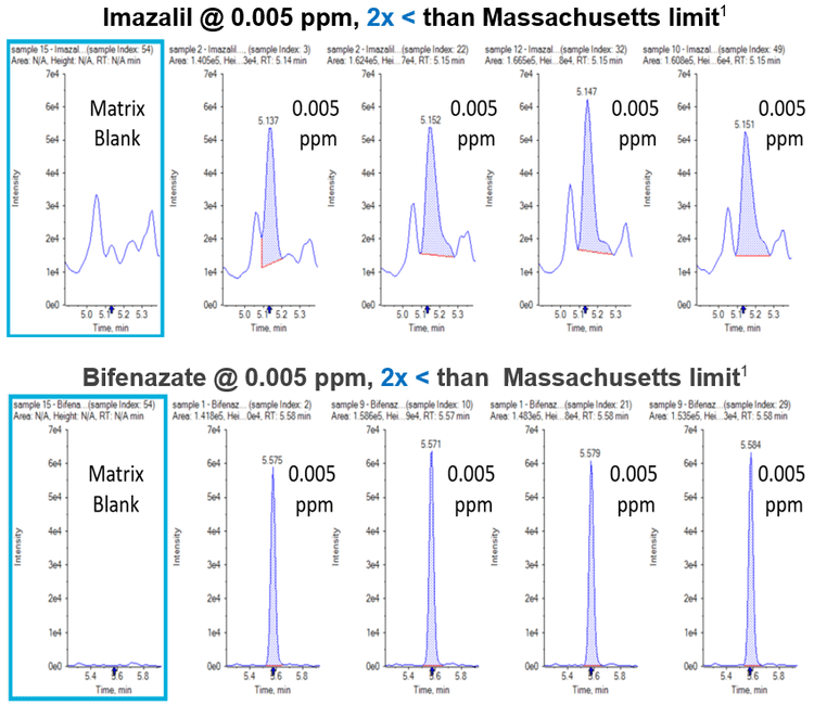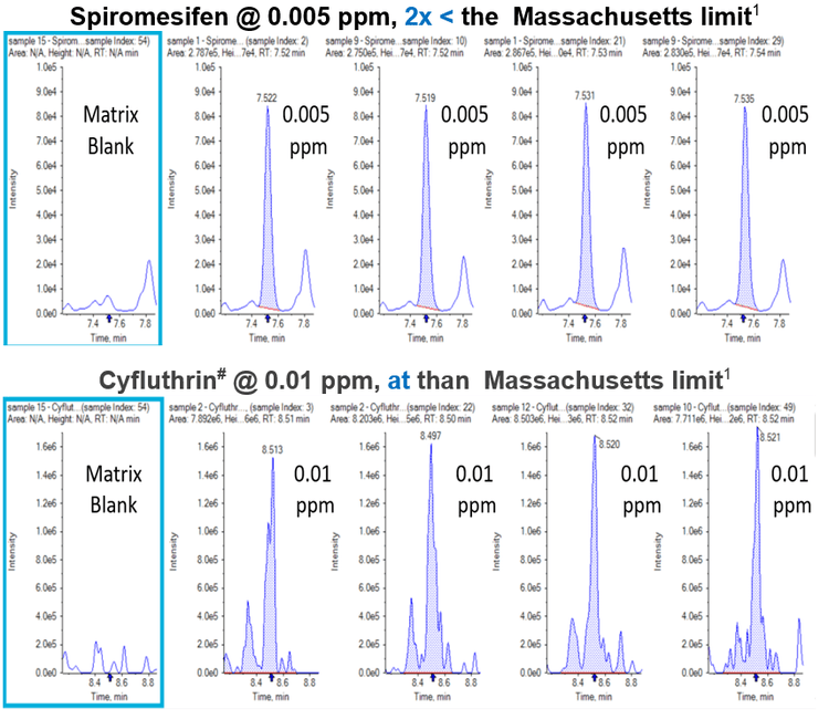 - Method performance demonstrated in cannabis flower extracts fortified ≤ Massachusetts required reporting limits1