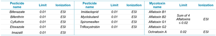 Table 1. The SCIEX Triple Quad 6500+ system can help meet or exceed all the Massachusetts pesticide1 and mycotoxin testing limits (µg/g or ppm) in cannabis flower summarized below.