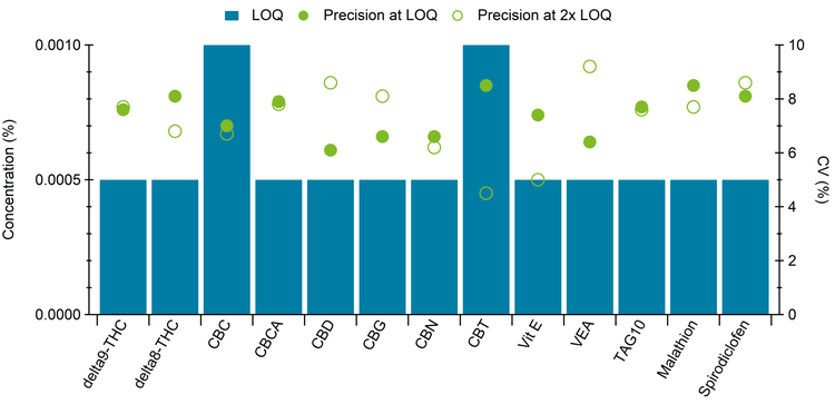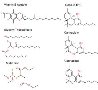 Sample preparation: Ten target analytes and three corresponding internal standards (delta-9-THC D3, delta-8-THC D3, and vitamin E-D6) were purchased from Cerilliant. A 10 µg/mL mix of target analyte was made in methanol alongside a separate 10 µg/mL mix of internal standards. These mixes were then diluted to two separate 1 µg/mL mixes for calibrator production in methanol. Triacylglyceryl decanoate (TAG10) was purchased neat and was diluted in isopropanol to 1 µg/mL before use. Solvent calibration curves were prepared from 1 ng/mL to 500 ng/mL. Depending on the analyte and its dilution, this corresponded to 0.0005% to 70% in sample. Each calibrator and sample contained 50 ng/mL of internal standards. E-juice formulations were diluted 1,000 times in methanol and subsequently fortified at 5 ng/mL, 10 ng/mL, and 20 ng/mL (in vial) in five replicates for each fortification level corresponding, after dilution, to 0.0005% to 0.002% in sample.