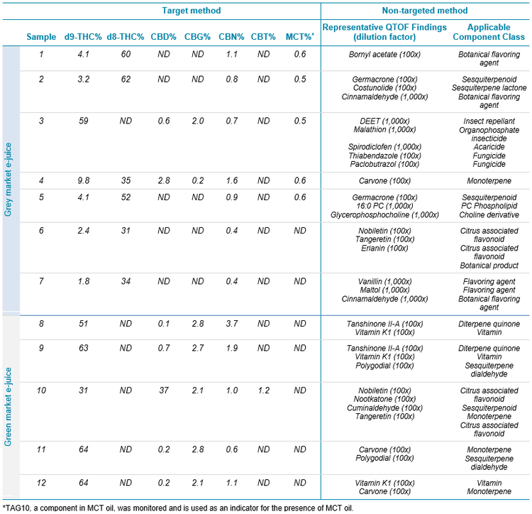 In the spirit of the original non-targeted search in e-juice that identified VEA, this study utilized spectral libraries on the SCIEX X500R QTOF system to investigate e-juice compositions (Table 1). Of most interest in the findings were the discovery in some of the grey market samples of pesticide contamination, phospholipids, and flavoring agents.