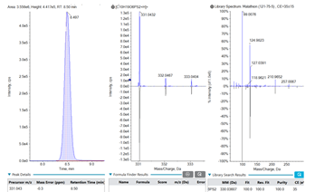 As an example, one of the grey market samples had several pesticides of concern in the finished product. Two of these, malathion and spirodiclofen, were confirmed using a targeted method and analytical standards. Figure 3 shows the library matching, mass accuracy, and isotopic ratio confidence for malathion seen in the non-targeted method.