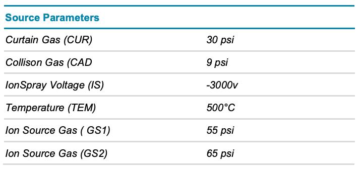 Analyses were performed using a SCIEX QTRAP®® 6500+ mass spectrometer in negative electrospray ionization mode. At least two MRM transitions were optimized for each analyte as outlined in Table 3 in order to quantify and confirm their concentration in all samples. Data was acquired using Analyst® 1.6.3 .and processed for quantitation and confirmation with reference to internal standards using MultiQuant™ 3.0.2 software.