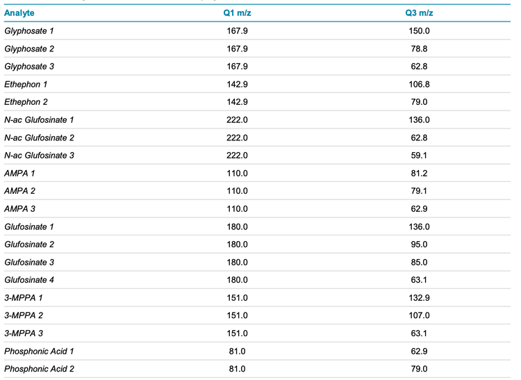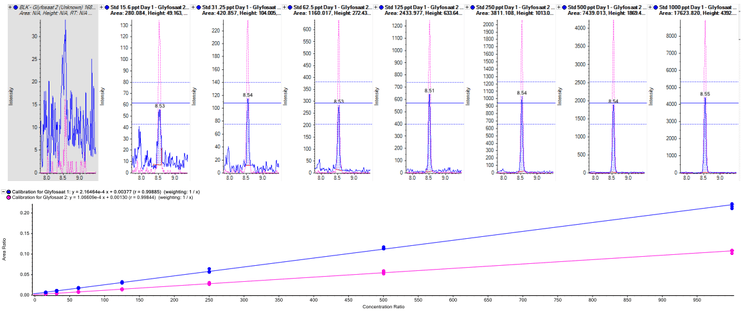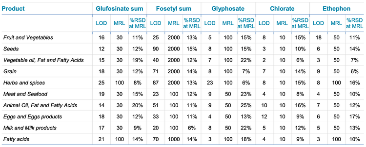 So, the final method, presented here, makes use of an IC column in a method-switching reverse phase (RP) system with MS amenable mobile phases at around pH 9. Such conditions configure glyphosate ideally for MS detection with good retention and separation of the other analytes and matrix interferences. The method meets the DG-SANTE1 requirements of reproducibility (<20%) and recovery (80-110%), and the LOD of the method is below 0.01 mg/kg. Excellent long-term stability and robustness were achieved throughout the validation of this method for food samples extracted by the QUPPE procedure.