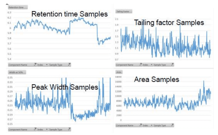 Chromatographic performance using both the NofaLab method for QuPPe extracts of food samples and the modified method for water samples achieved good separation between the analytes and from matrix interferences, and excellent repeatability in terms of peak profile and retention time. The EU maximum residue limits for these compounds in food samples range from 10 to 2000 μg/kg, depending on the commodity and compound4 , so the target for each is variable. Although water regulations are under discussion, a detection limit of 20 ng/L for environmental samples is desirable in anticipation of future regulation. Some analyte/matrix combinations proved to be particularly difficult, but these target concentrations were easily achieved for all samples in the verification of the methods. Over 1000 food samples from a variety of commodities were analyzed at NofaLab without maintenance of the system, and the stability in terms of retention time, peak width, peak area and tailing factor was found to be excellent. Figure 1 shows several measures of reproducibility based on the glyphosate internal standard.