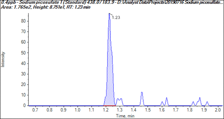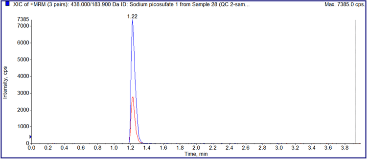 Two ion pairs were monitored for the sodium picosulfate; both using the precursor ion of 438 m/z; the quantifier product ion was 183.9 m/z and the qualifier product ion was 277.9 m/z.