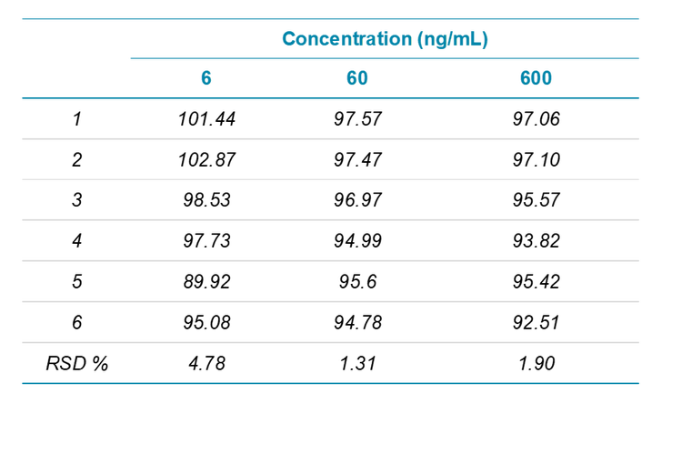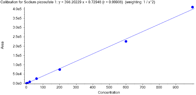 - Wide linear range: Assay provided wide linear dynamic range for sodium picosulfate, across a concentration range of 0.4~1000 ng/mL (Figure 3).
