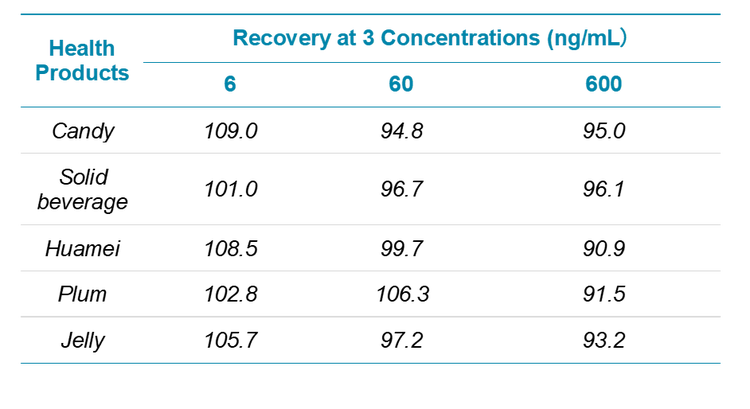 - Wide application range: This method verifies the recovery rates of the five substrates mentioned in the standard (Table 1) with minimal interferences.