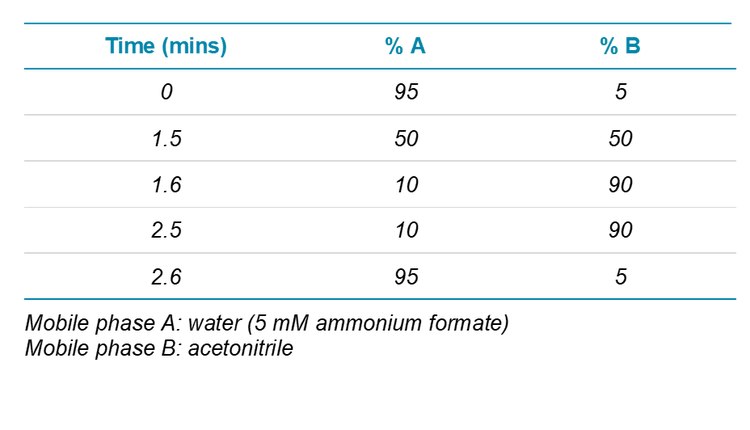 LC Conditions: SCIEX ExionLC™ AD System was used with Phenomenex Kinetex C18, 2.6 µm, 2.1 mm × 50 mm analytical column. A gradient elution was used with flow rate of 0.6 mL/min, injection volume of 5 μL, and column temperature of 40 ºC (Table 2).