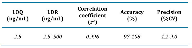 - Excellent accuracy (101%) and precision (3.9% CV) at the 2.5 ng/mL LOQ level