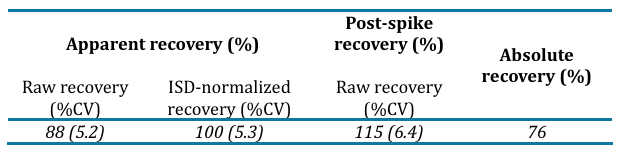 - A 76% mean absolute recovery of the matrix spikes and calculated LOQ of 45 µg/kg