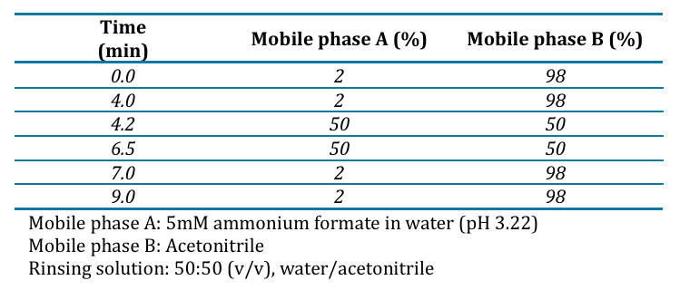 The Phenomenex Luna Omega SUGAR column provided good retention for acrylamide and separation from the void volume, while also separating the 3 interferences (3- aminopropanamide, lactamide and N-acetyl-β-alanine). A mixed standard containing acrylamide (100 ng/mL) and the 3 interferences (500 ng/mL) was injected to investigate potential coelution. As shown in Figure 2, the optimized chromatographic conditions resulted in ~1.5 min separation from lactamide (RT=5 min) and ~3.5 min separation from N-acetyl-β-alanine (RT=8 min). The 3-aminopropanamide was not detected during any injection. It is postulated that the 2 amine functional groups resulted in very high retention for this compound on the column.