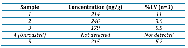 Five different coffee samples were purchased from a local store, processed through the extraction protocol and quantified against a single solvent calibration curve. Four of the 5 samples exhibited acrylamide concentrations greater than the solvent-based LOQ, at levels ranging from 179 ng/g to 245 ng/g (Table 6). Interestingly, the unroasted coffee was the only sample that did not contain detectable acrylamide levels.