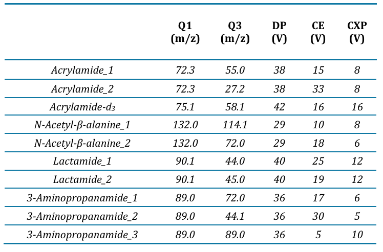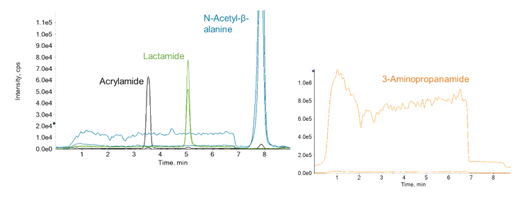 The potential impact of 3 known acrylamide inferences (N-acetyl-β-alanine, lactamide and 3-aminopropanamide) was evaluated by spiking 1 mL of LC-MS grade water before and after the extraction protocol was completed. The pre-extraction level was 150 ng/mL for acrylamide and 1500 ng/mL for the interferences.