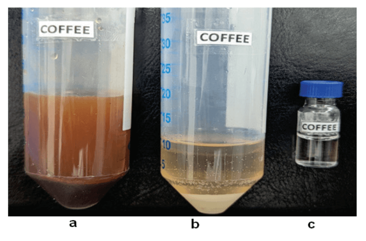 Sample preparation: A 1 g sample of the pooled ground coffee was weighed into a 50 mL plastic centrifuge tube. Then, 20 mL of water was added and the resulting solution was vortexed for 20 minutes and centrifuged at 4500 rpm for 10 minutes. After centrifugation, 3 mL of the water layer was collected for SPE clean-up using Phenomenex Strata™ X cartridges (33 µm, polymeric reversed phase, 500 mg/6 mL, P/N: 8B-S100-HCH). Cartridges were conditioned with 5 mL of methanol followed by 5 mL of water. The 3 mL aqueous coffee extract was loaded and discarded. The acrylamide was eluted with 2 aliquots of 3 mL of water and collected in a clean 50 mL tube. Further cleanup was performed using a QuEChERS method by adding 3 mL of acetonitrile, 2 g of MgSO4 and 2 g of NaCl to the aqueous SPE eluent. The solution was vortexed for 10 minutes and centrifuged at 4500 rpm. After centrifugation, 1 mL of the upper acetonitrile layer was collected and filtered using a Phenomenex 0.22 µm PTFE (hydrophobic) syringe filter (P/N: AF8-7702-12) prior to LCMS/MS analysis. The sample preparation efficiency is visually shown in Figure 2.