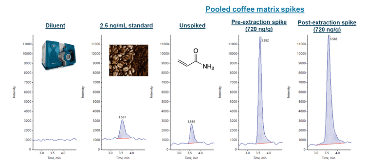 Procedural recoveries in the spiked coffee matrix: Five different ground coffee samples were purchased and pooled for the matrix spikes. Prior to the spiking experiments, the pooled coffee sample was analyzed to quantify the background acrylamide levels. The pooled coffee sample contained approximately 230 µg/kg of acrylamide. As prescribed by the AOAC SMPR document, matrices with high inherent acrylamide levels were spiked at 3–5x the background level. Therefore, the acrylamide spike concentration was 720 ng/g. The acrylamide-d3 internal standard was spiked at 1500 ng/g.