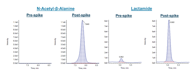 In an additional experiment, the 3 interference chemicals were spiked into the pooled coffee sample and processed through the sample preparation. Figure 3 shows the results of the pre- and post-extraction spikes for N-acetyl-β-alanine and lactamide. The N-acetyl-β-alanine was completely lost during the sample preparation, whereas only about 10% of the lactamide was retained. Overall, these results demonstrate that the interferences did not impact the acrylamide peak. That is, the chemicals were concurrently unretained during sample preparation and chromatographically separated from the target acrylamide peak.