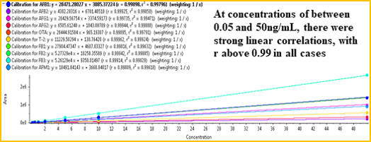 At concentrations between 0.05 and 50ng/mL, there were strong linear responses for all mycotoxins (Figure 7); the correlation coefficients were greater than 0.99, fully meeting quantitative analysis requirements.
